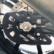 一体型のブレーキディスクガードは、衝突時や激しい走行時に、石やその他の固形物からリアブレーキディスクを保護します。