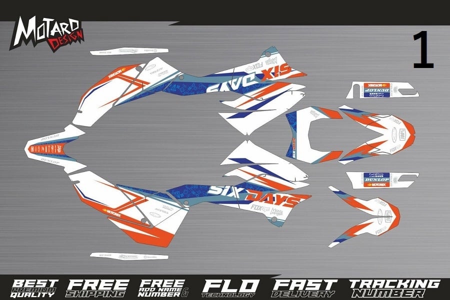 MXGP、MX2、ラリーダカールで使用されているのと同じ世界最高の素材を使用しています。 プレミアムな高光沢、マット、ゴールドまたはコズミック仕上げ。 21 mil.厚のグラフィック素材。 難しい基材(モトクロスバイク、ATV、スポーツバイクなど)に簡単に接着できるように特別に設計されています。 簡単なインストールプロセス。 気泡のないFLOテクノロジー。 UV保護層。 印刷の色はほとんどのオートバイの OEM の色と一致しますが、常に微妙な違いが生じる場合があります。