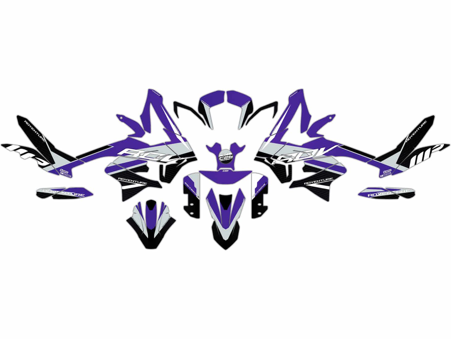 - フルグラフィックキット付属:ヘッドライトカバー、ラジエーターシュラウド、フロントとリアフェンダー、ロアフォークガード、スイングアーム、エアボックス、ガスタンクとキャップ、リアサイドカバー